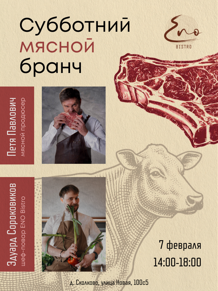 В субботу, 7 февраля с 14:00 в ENO Bistro — мясной бранч, на котором Петя Павлович — профессиональный мясник, автор знаменитых «цельноживотных ужинов» и Telegram-канала «Мечты Пети о мясе» — будет знакомить гостей с мясной культурой.